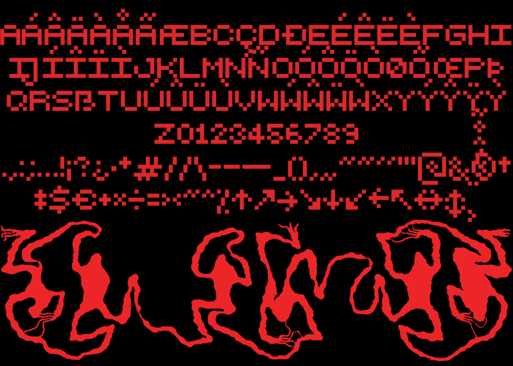 Groupie is an art and typographic project that contains an experimental FREE open source typeface in 7 different forms: Ezekyell, Sanguinaire, Folie furieuse, Polymorphea, Neydermeyers, Kaleidoscorpse and Achromatic. Composed of classical latin glyphset, Groupie is a pixel font with a simple letterform and very complicated designs, the goal being to create something very complex with 2 simple methods. You have the choice of interpretation, we can see faces hidden in the shapes when it is very close everywhere in the fonts, you can consider them as simple letters. Please note that the kerning has not been done, it is not lazy (maybe) but my 2012 mac was going to blow up, literally. To export the fonts, please avoid ticking Autohinting and Remove Overlap because of the complexity of the pixels.
